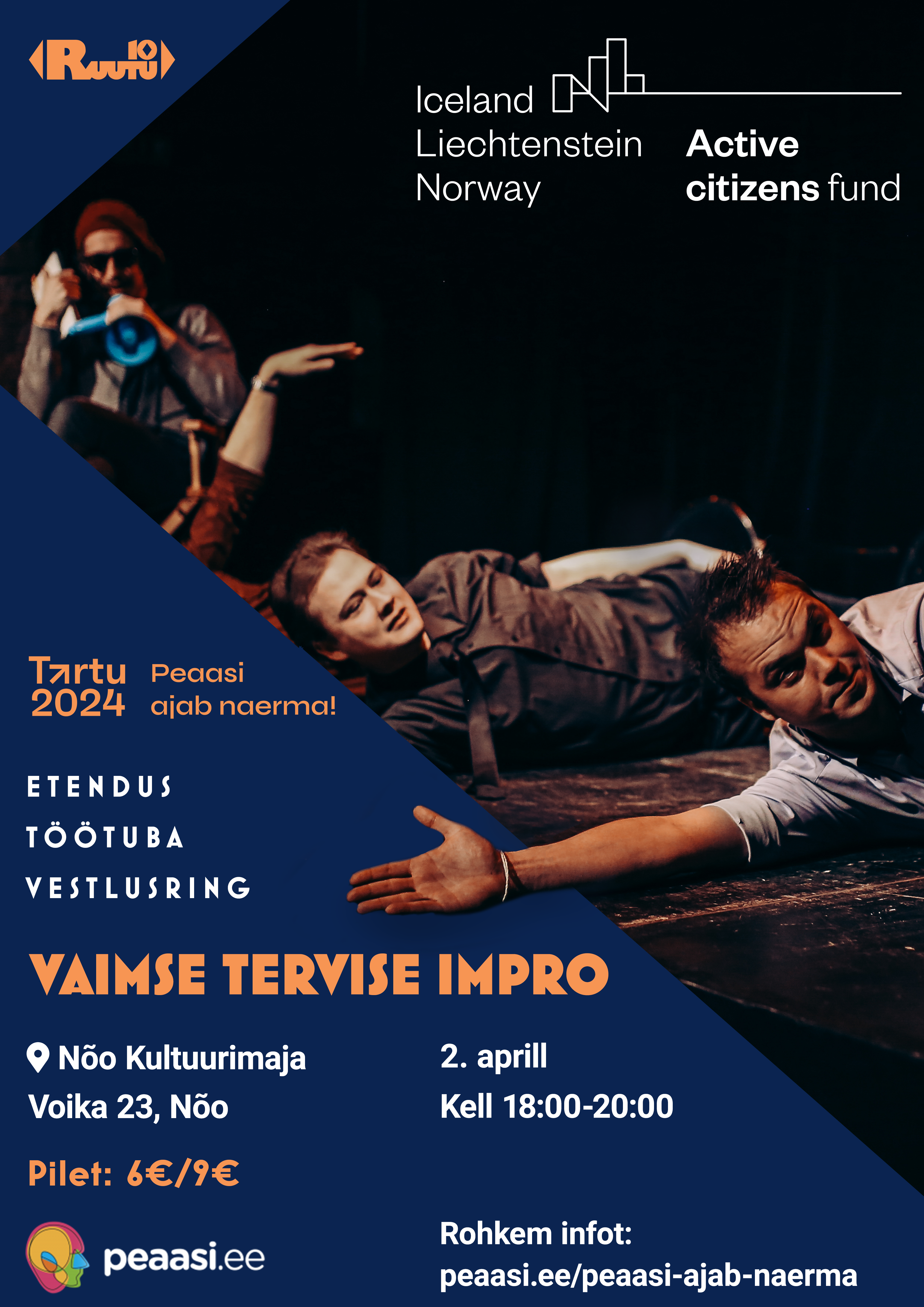 Peaasi.ee, Ruutu10 ja Tartu 2024 eestvedamisel stardib 2. aprillil kell 18 Nõo Kultuurimajas Euroopa kultuuripealinna projekt “Peaasi ajab naerma!”. Sündmusel saadakse osa meeleolukast vaimse tervise improetendusest, aruteluringist ning töötoast. loe edasi Lõuna-Eestis algab vaimset tervist toetav improvisatsioonituur