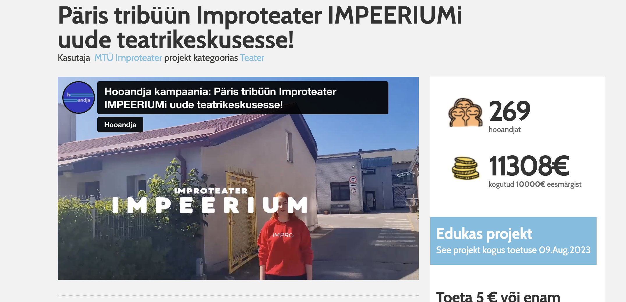 Sel sügisel avab improteater Impeerium Tallinnas Põhjala tehases teatrisaali, kus lisaks enda etenduste mängimisele saavad esinemisvõimaluse ka teised teatrid ja artistid. Seoses värske teatrisaali avamisega otsib Impeerium endale uut nime avaliku nimekonkursi kaudu. loe edasi Päris tribüün Improteater IMPEERIUMi uude teatrikeskusesse!